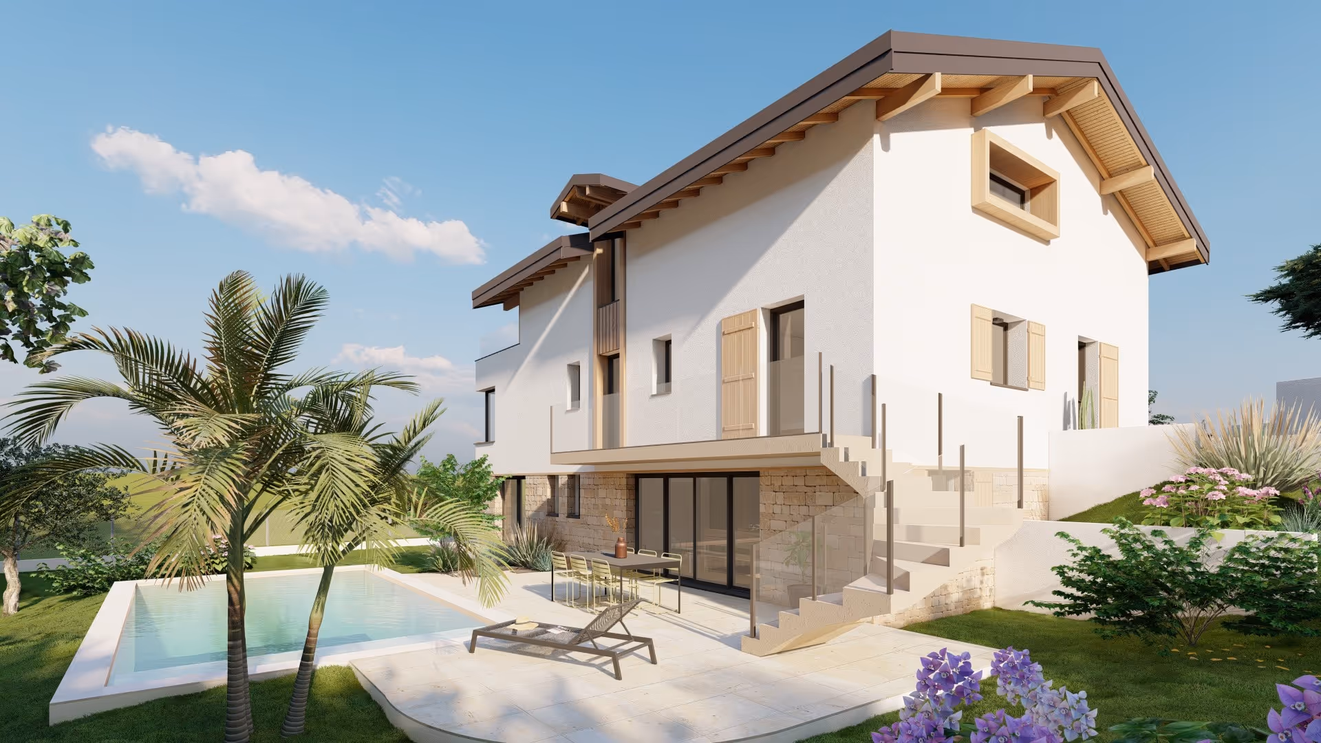 Afin d’éviter l’effet de hauteur (mur en fronton) nous avons joué avec la matérialité et le volume. La pierre, les parties maçonnées blanches, le bois, le verre et le métal s’allient ici avec équilibre pour créer une esthétique panachée et harmonieuse. Les façades latérales sont pourvues de lucarnes contemporaines toujours dans une volonté de réaliser des cadrages de vues sur le paysage.
