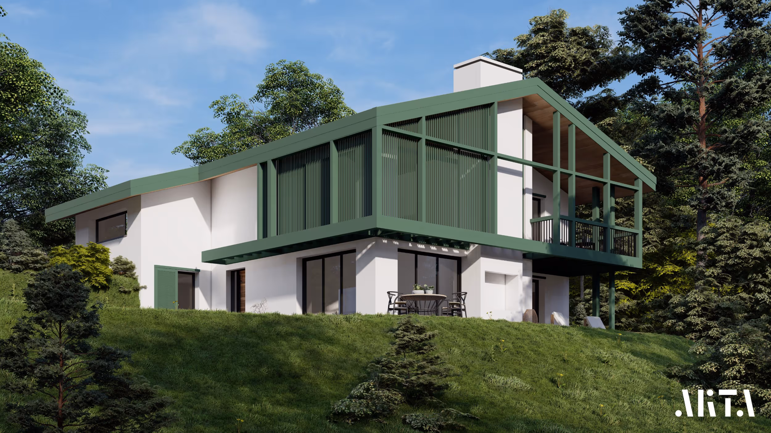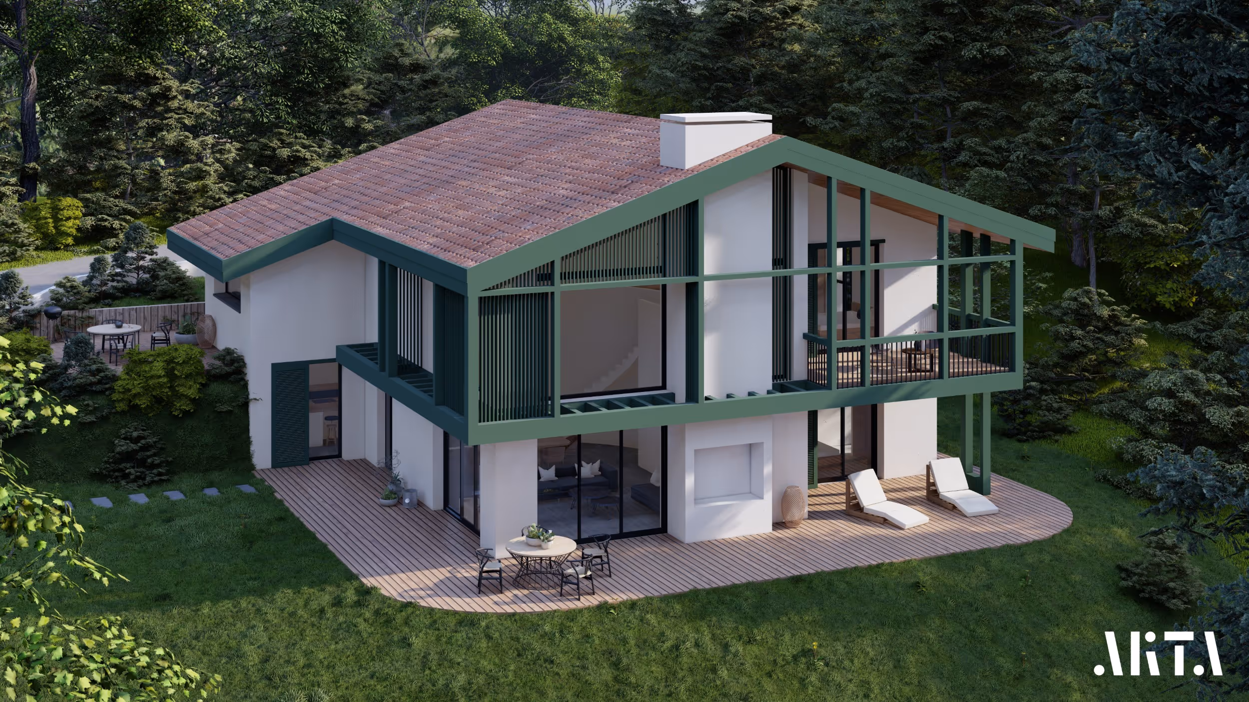 Le travail s’est porté d’une part sur la toiture qui a été prolongée pour créer de larges avant toits caractéristiques des nobles villa néo-basque. D’autre part, une structure bois en saillie s’insère sur le premier étage et se déploie verticalement à l’aplomb de l’avant toit dont les poteaux viennent rappeler les colombages présents dans l’architecture traditionnelle et néo. Ces éléments structuraux donnent un rythme typique à la façade et casse la verticalité abrupte du pignon principal.
