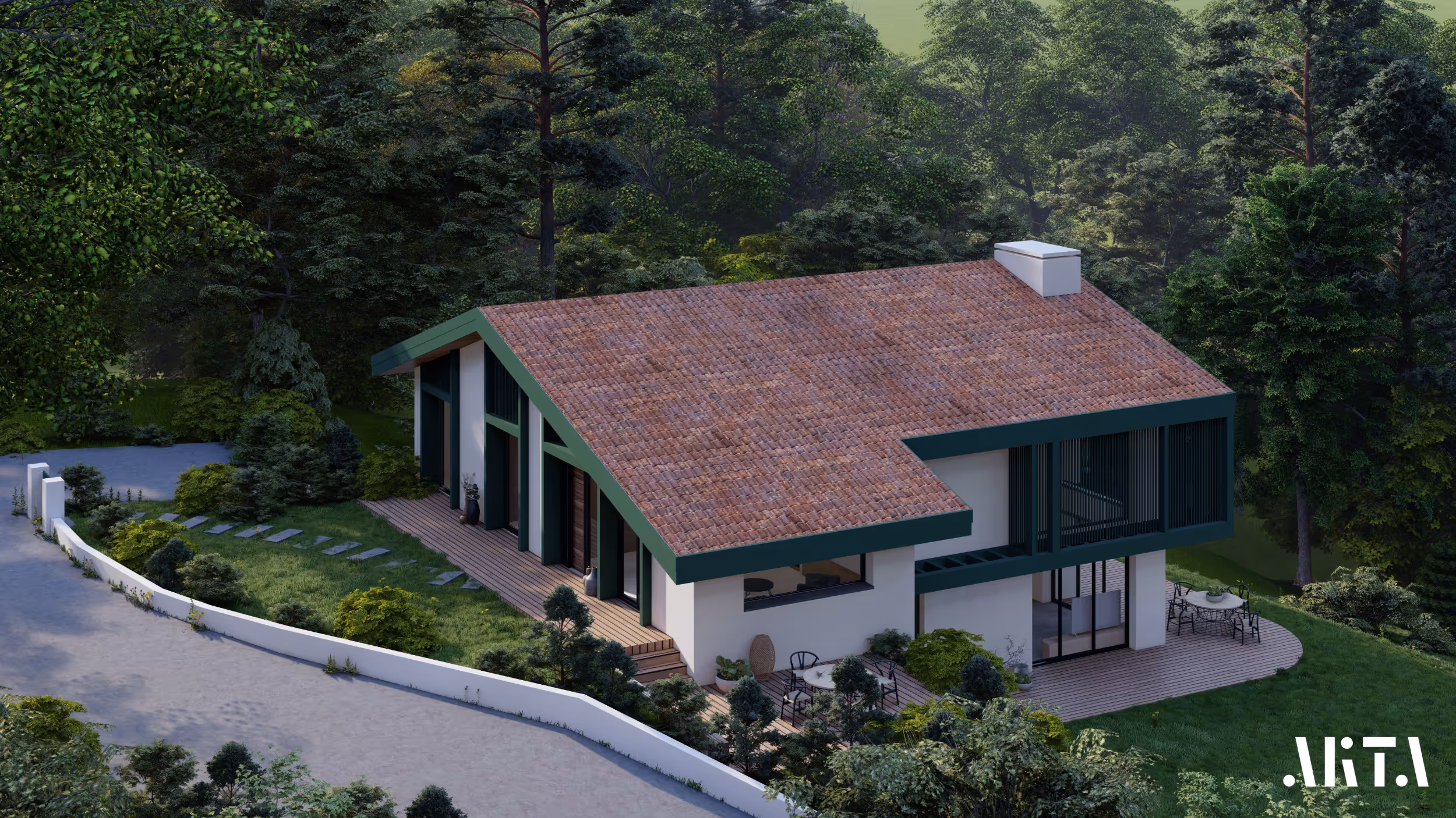 Un appartement principal pour la famille du client comportant un magnifique séjour cathédrale au sud avec en vis-à-vis une généreuse cuisine ouverte avec cellier. Sous l’escalier se trouve un passage donnant sur les pièces de nuit du rez-de-jardin. L’ensemble du niveau s’ouvre sur une importante terrasse bois qui encercle la maison à l’est, au sud et à l' ouest. L’escalier courbe nous transporte à l’étage sur le haut volume du séjour d’où, depuis de larges ouvertures se révèle une cime magnifique composée à la fois des sommets des Pyrénées et des arbres centenaires environnants.