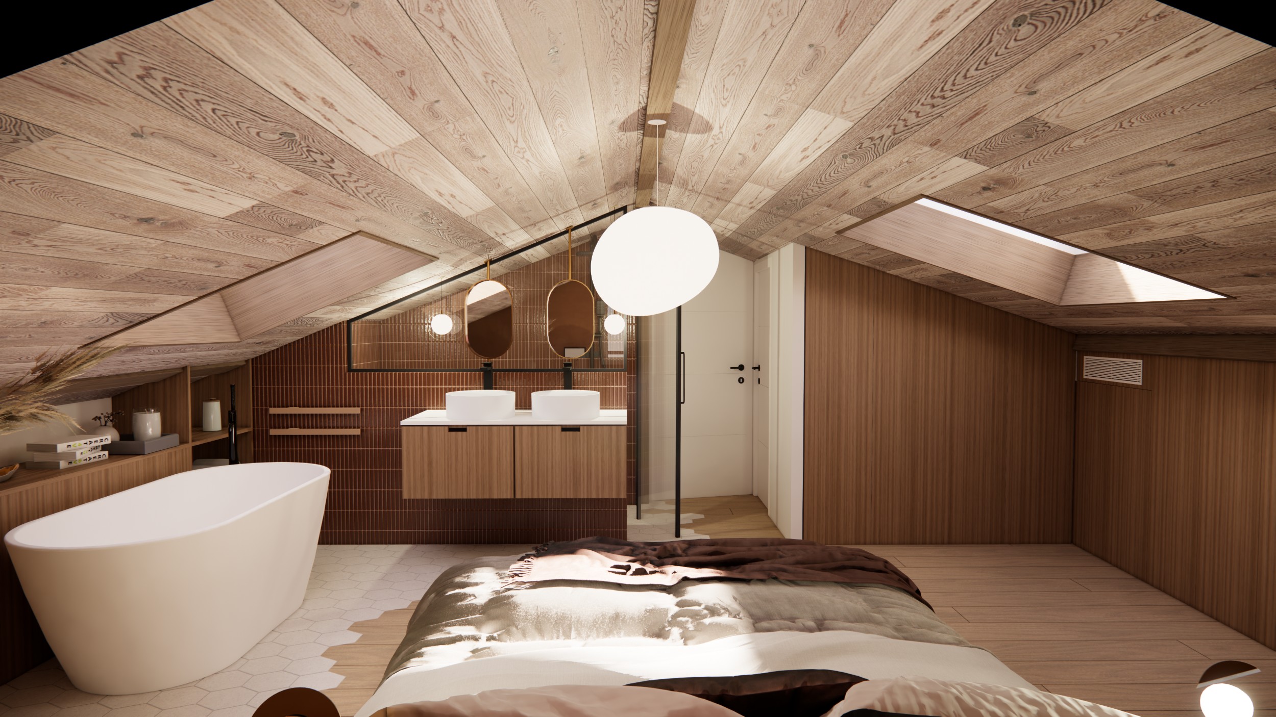 L’escalier prend également sa place et donne accès à l’étage qui est composé d’une petite chambre d’appoint et d’une belle suite parentale. Celle-ci a dû être agencée de manière fonctionnelle et aérée, baignée de lumière par des ouvertures en toitures qui en prime donnent une vue sur la chaîne des Pyrénées et les Trois Couronnes.