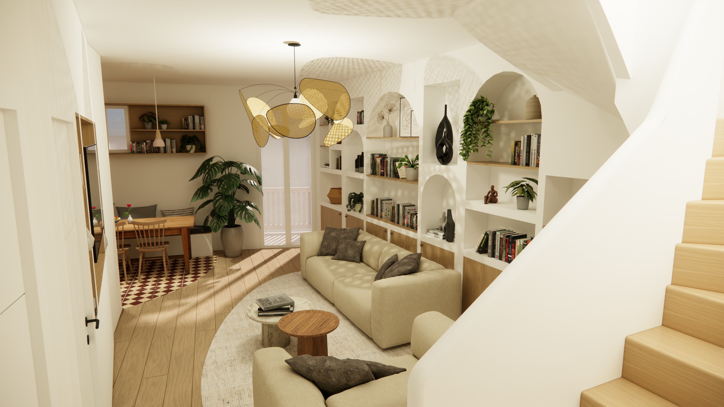 Au niveau de l’étage principal, la cuisine se trouve près de l’entrée et le salon au sud près du balcon, les chambres et la salle d’eau s’ouvrent alors sur les espaces de vie en quinconce.